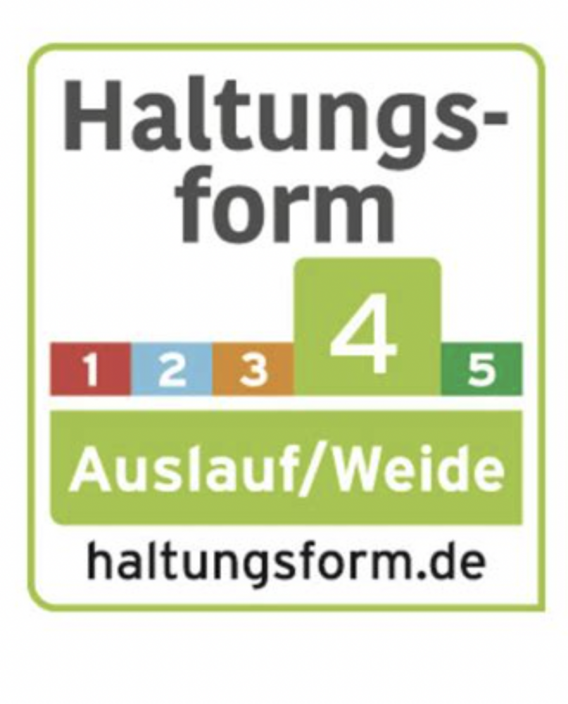 ![]() | Erläuterung: Die vierstufige Haltungsform-Kennzeichnung ist seit Sommer 2024 fünfstufig. Die ehemalige vierte Stufe „Premium“ wurde aufgeteilt und die Kennzeichnung um eine separate fünfte Stufe für Bio ergänzt. Die neue Haltungsform 4 – Auslauf/Weide steht für tierwohlgerechte Bedingungen, die deutlich über den gesetzlichen Mindeststandards liegen. Tiere in dieser Haltungsform haben u.a. mindestens 100 % mehr Platz als gesetzlich vorgeschrieben und dauerhaften Zugang zu Außenklimabereichen wie überdachten Ausläufen, Weideflächen oder Auslaufbereichen mit Frischluft. |
